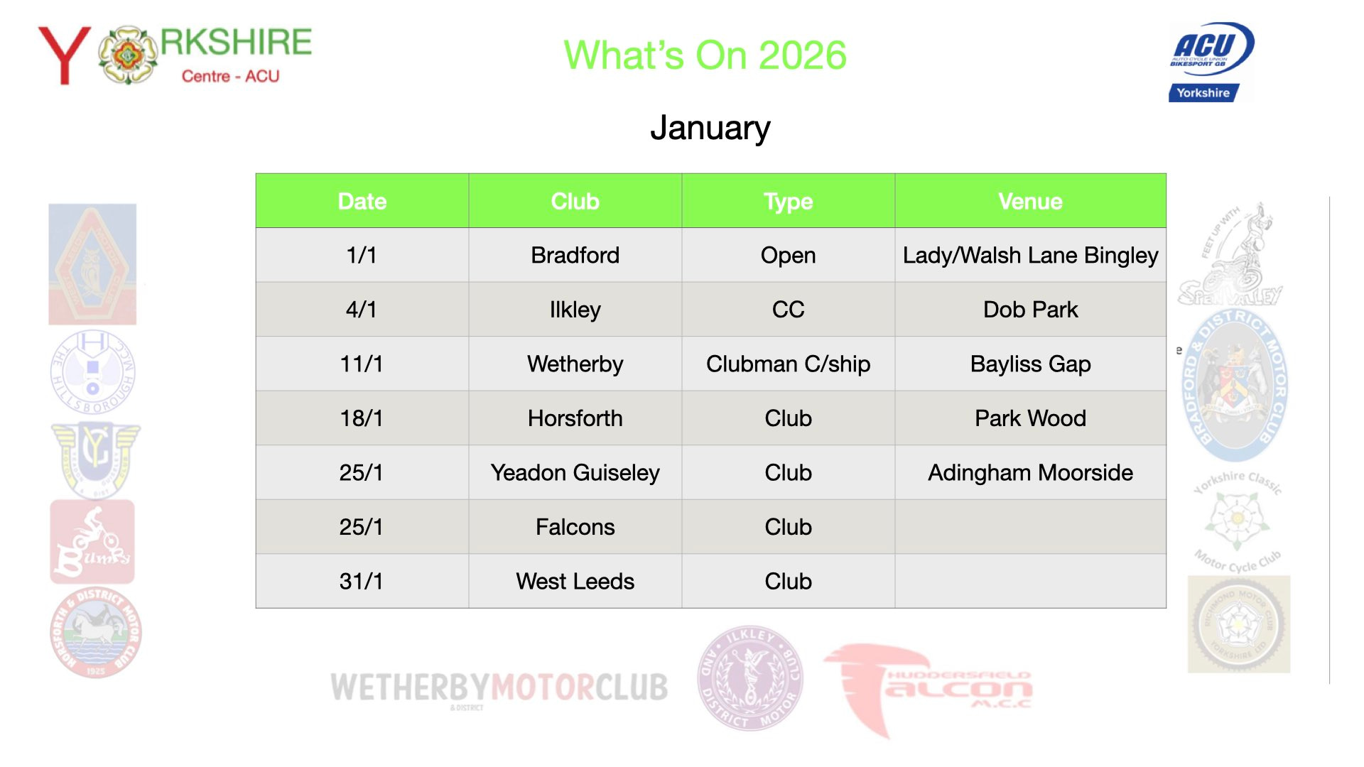 Motorsport activities within the Yorkshire Centre are coordinated by clubs affiliated with the Auto-Cycle Union (ACU), the recognised governing body for the sport.