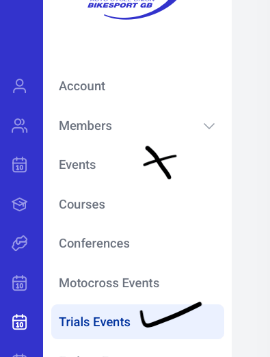 Log into your profile then on the left side of the screen where you normally select “events” and scroll down to the event you want and complete the details. NOW you actually select “Trial Events” and then find the event you want.. Note screen shot is from a laptop.