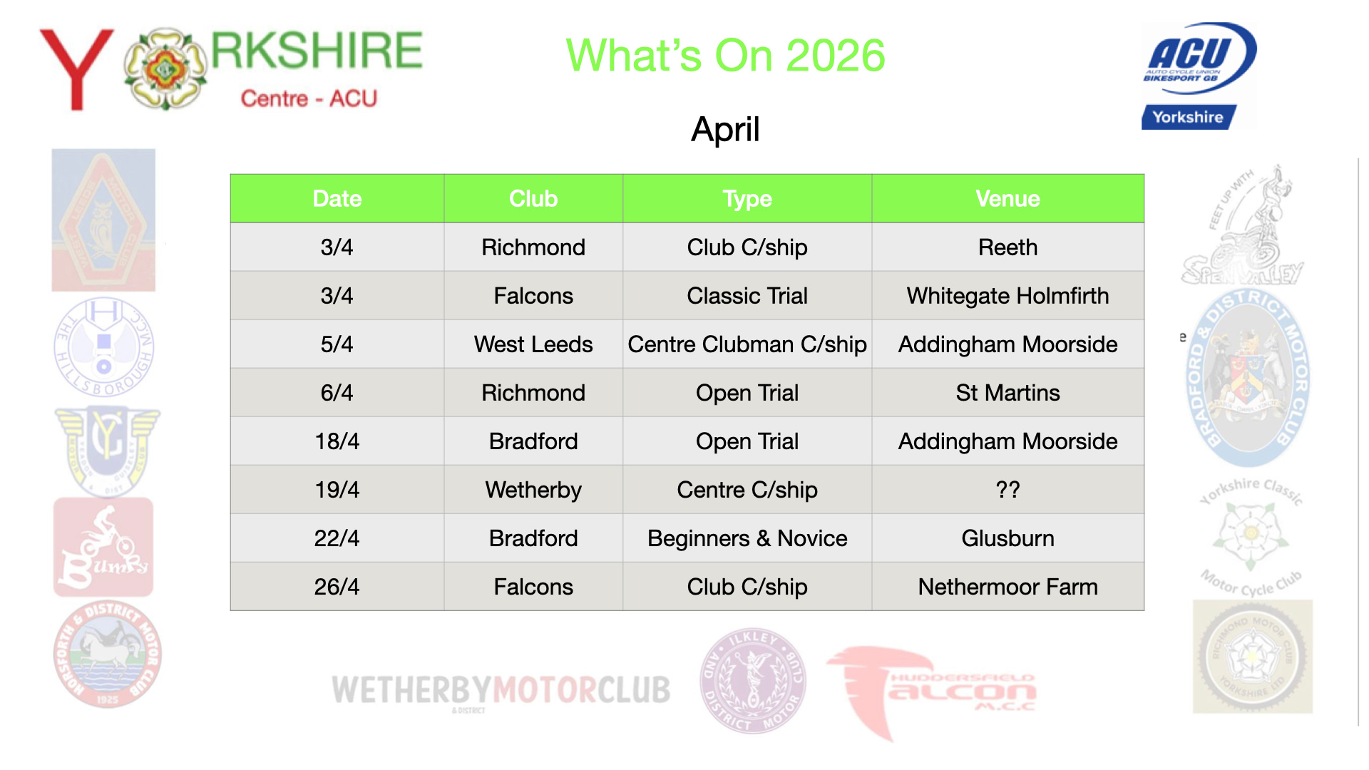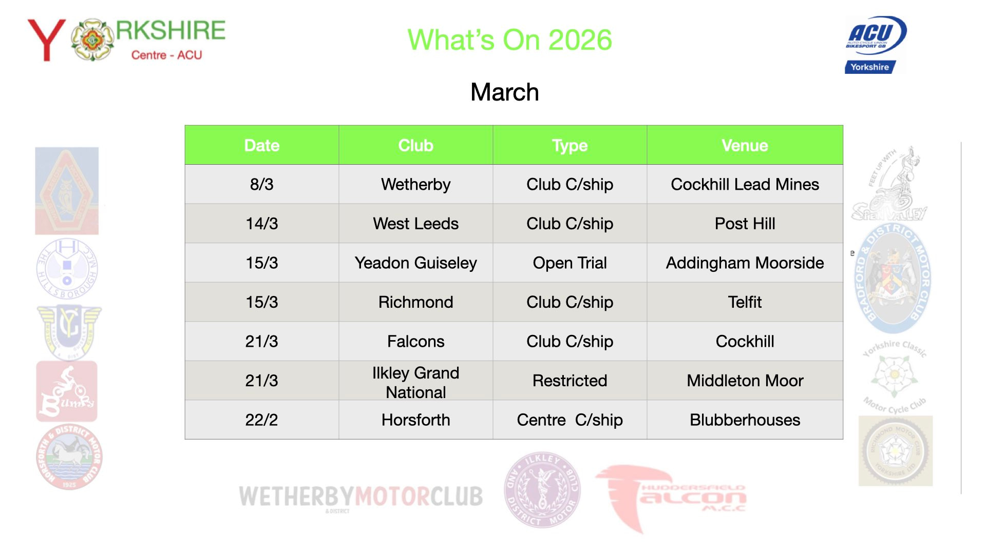 Motorsport activities within the Yorkshire Centre are coordinated by clubs affiliated with the Auto-Cycle Union (ACU), the recognised governing body for the sport.